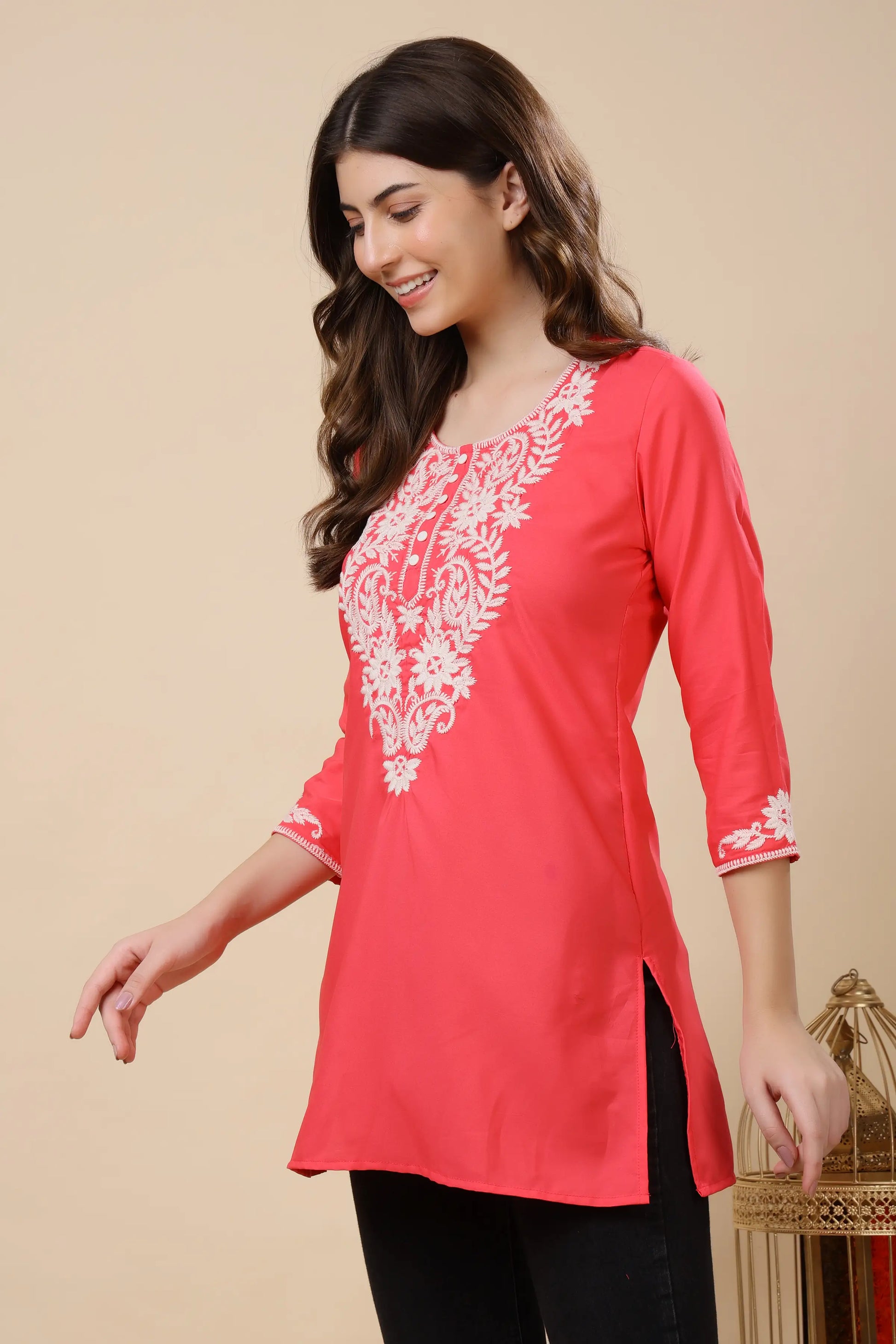 Rabric Coral Pink Crepe Short Kurti for Women with Embroidered V Neck & Sleeves