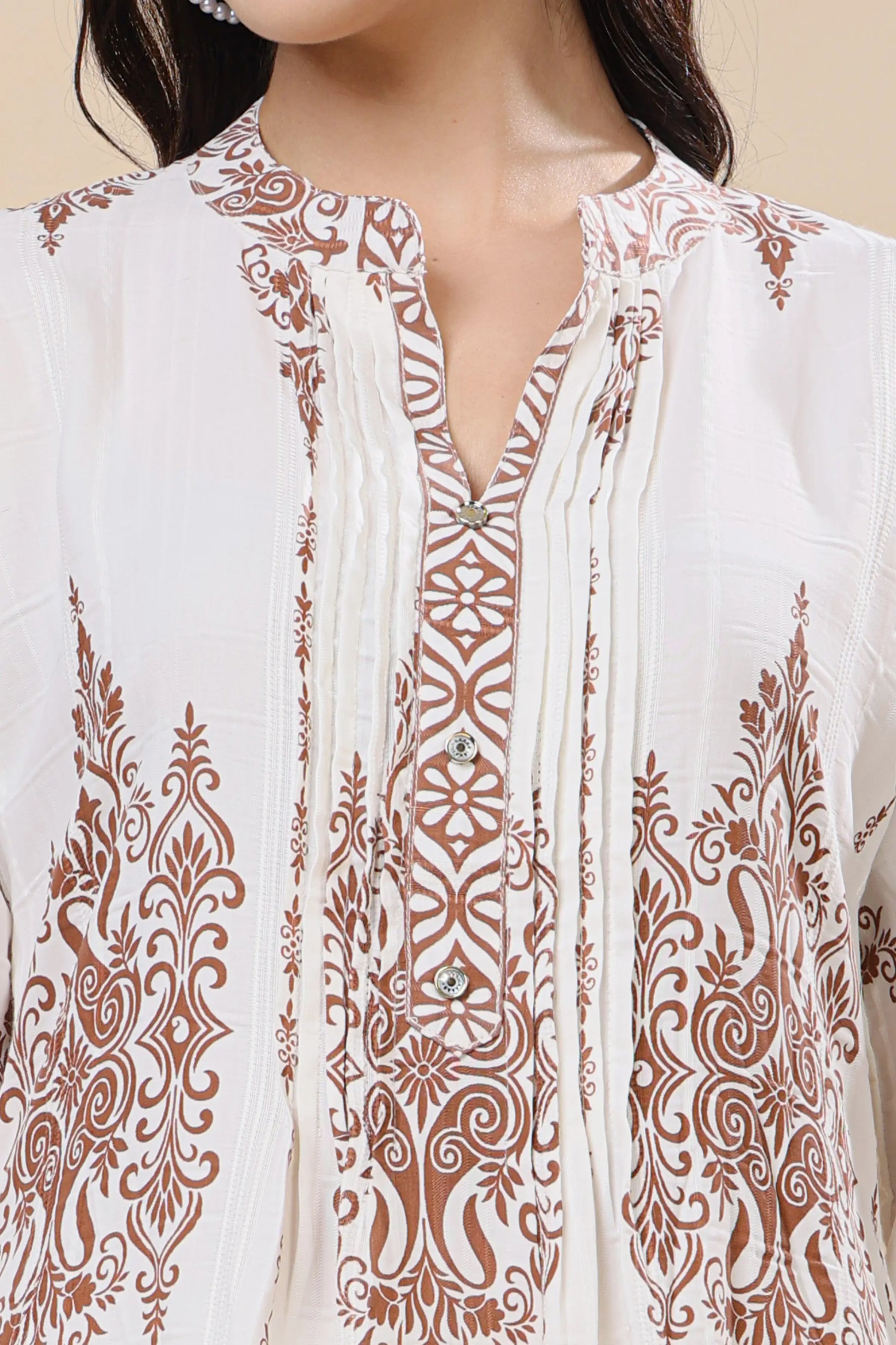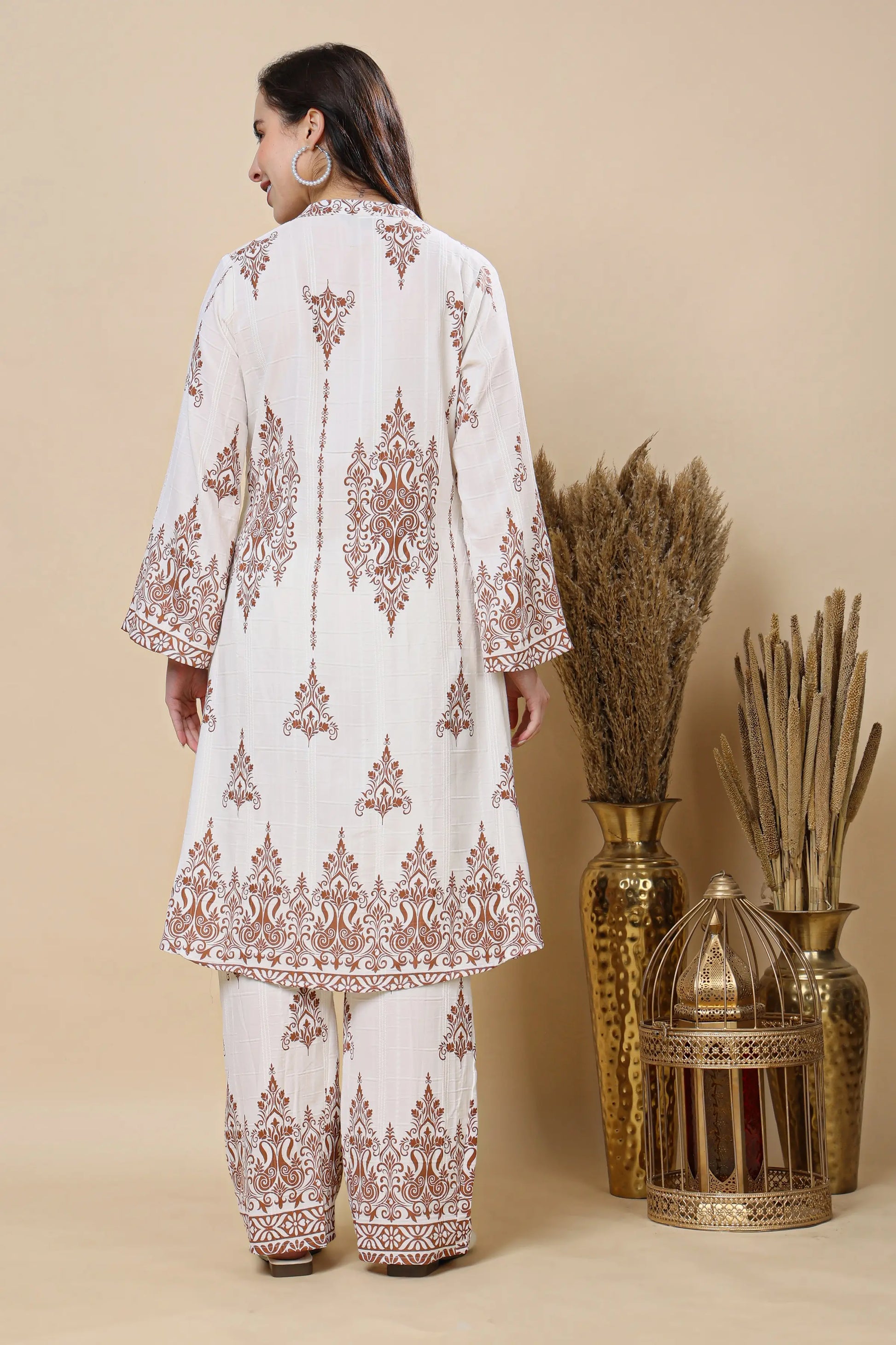 Elegant White & Brown Floral Printed Long Kurti Co-ord Set for Summer
